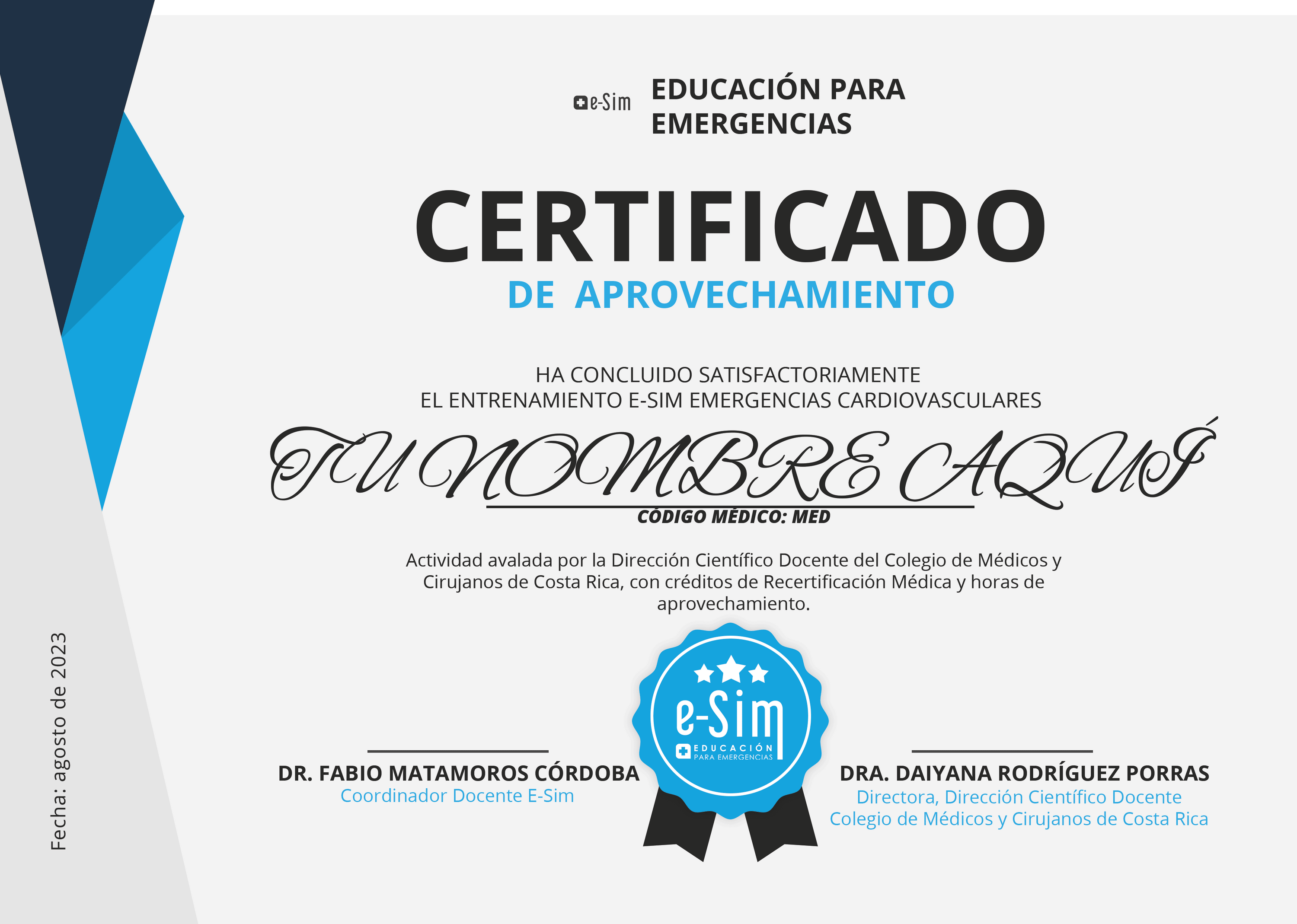 E Sim Educación te presenta, el entrenamiento más completo en emergencias cardiovasculares. No solo es un curso, es una transformación profesional respaldada por el Colegio de Médicos y Cirujanos de Costa Rica con 78 horas de aprovechamiento y 20 puntos de Recertificación Médica.